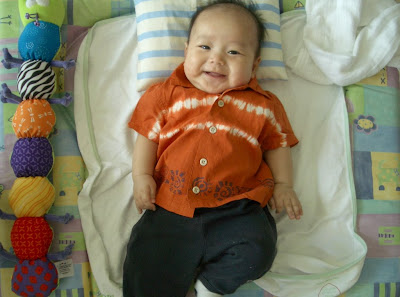Have you noticed that Ethan's hair looks neater now? That's because he had his first haircut last week. We couldn't take pictures as it took both Mummy and Daddy to pull it off. Mummy sat him on the bathroom counter-top with his feet in the sink while Daddy trimmed his sides and top. Even more handsome than usual!