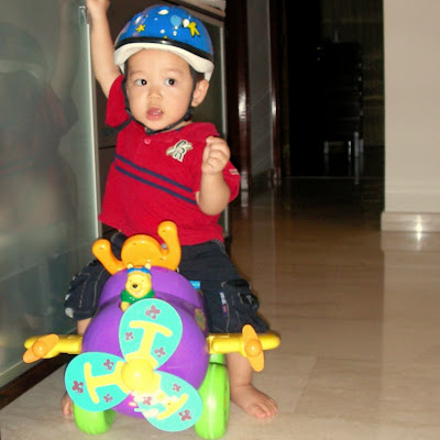 Ethan has sure come a long way since not enjoying having hats on his head. He will wear hats and especially this helmet for a long time. We thought he looked extra sporty in it while flying his Pooh aeroplane.
