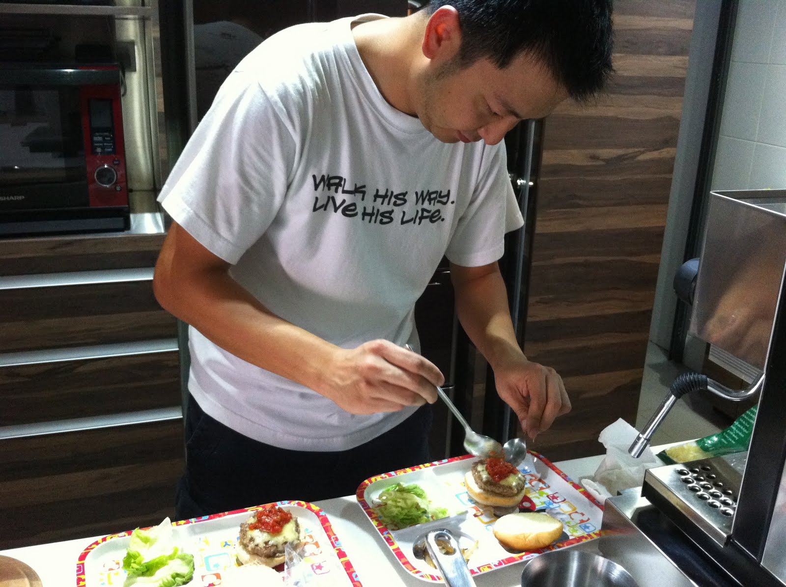 I had the grand idea of making "mini burgers" for the kids the other day. They can't eat burgers like we usually do cos their mouths are too small! So I bought soft dinner rolls for buns and made home-made mini beef patties with rosemary, grilled with melted cheese, sauteed mushrooms and onions, and topped with Daddy's special home-made tomato sauce.